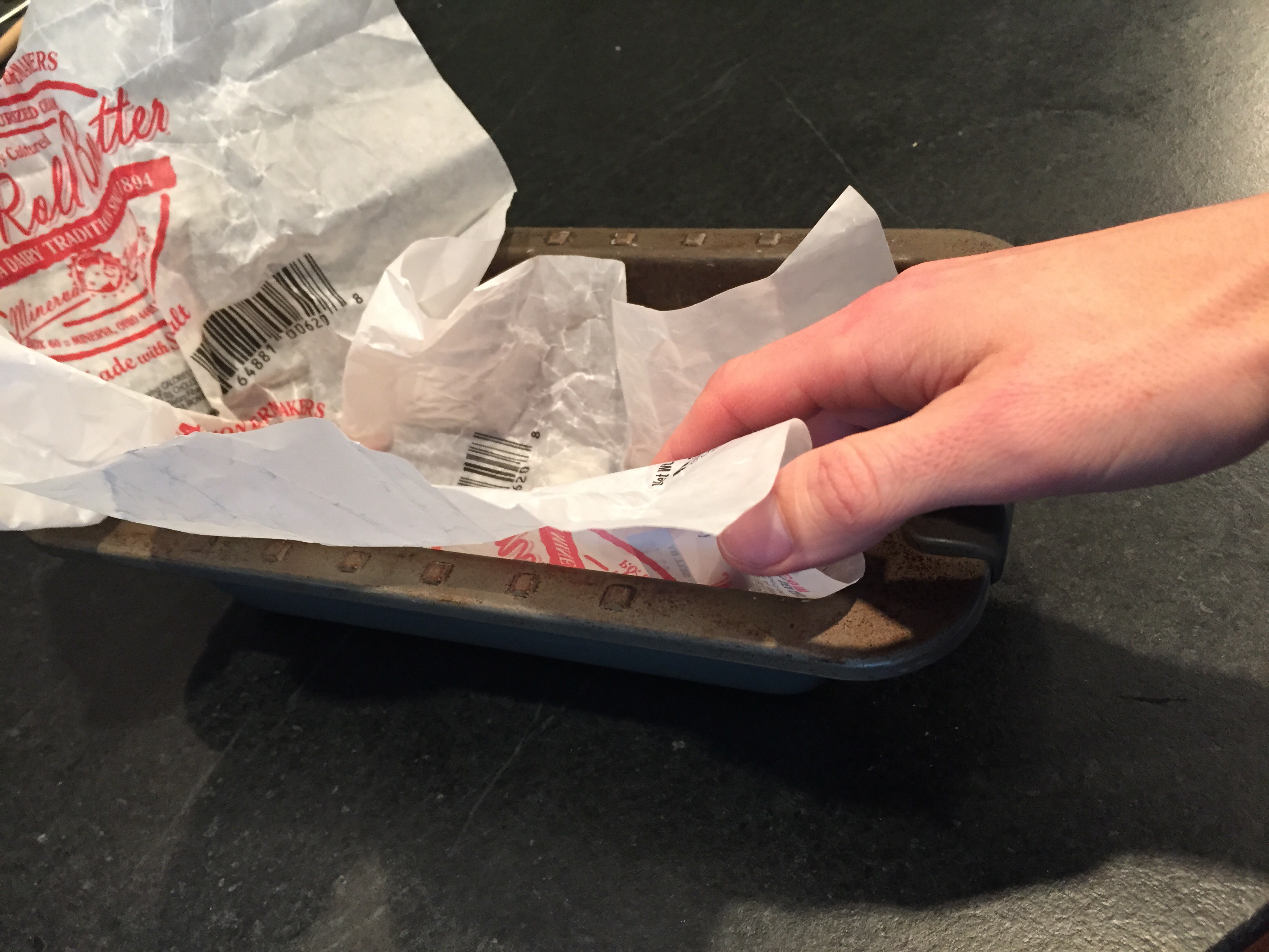 So here I used the paper from a recently devoured Amish Roll Butter to grease my loaf pan. Waste not, want not, I always say!