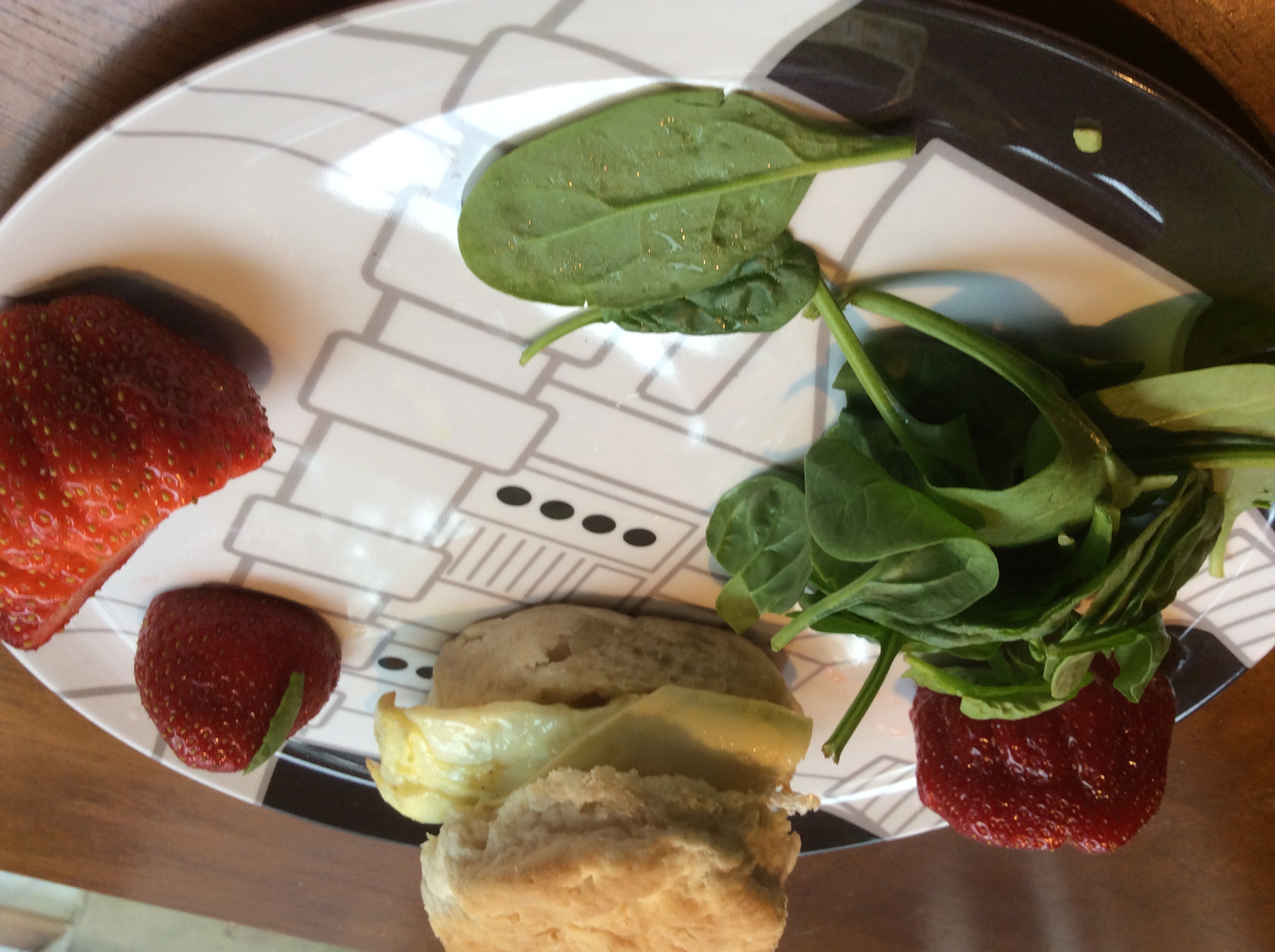 Here was one of the boy’s lunches this week. Hulled strawberries and spinach as-is always make an easy and accompaniment to any meal, so as long as my boys keep eating these, I’ll keep serving them! We picked up a few of the extra shortcake biscuits at the end of the Strawberry Festival, and they doubled as lunch biscuits for these egg sandwiches.