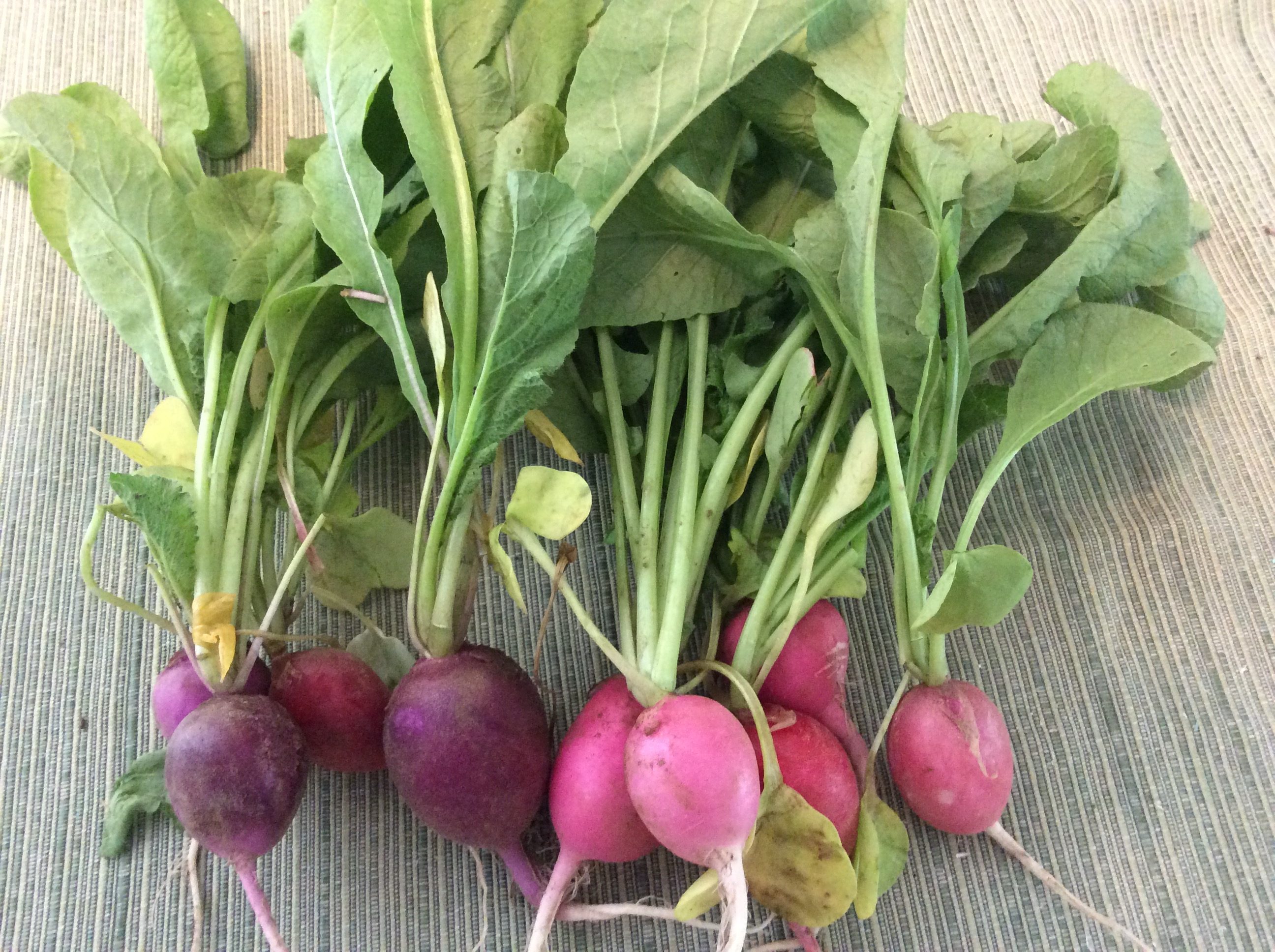 The first radishes out of the farm are always great! When they are small and tender like this, the greens are delicious sautéed.