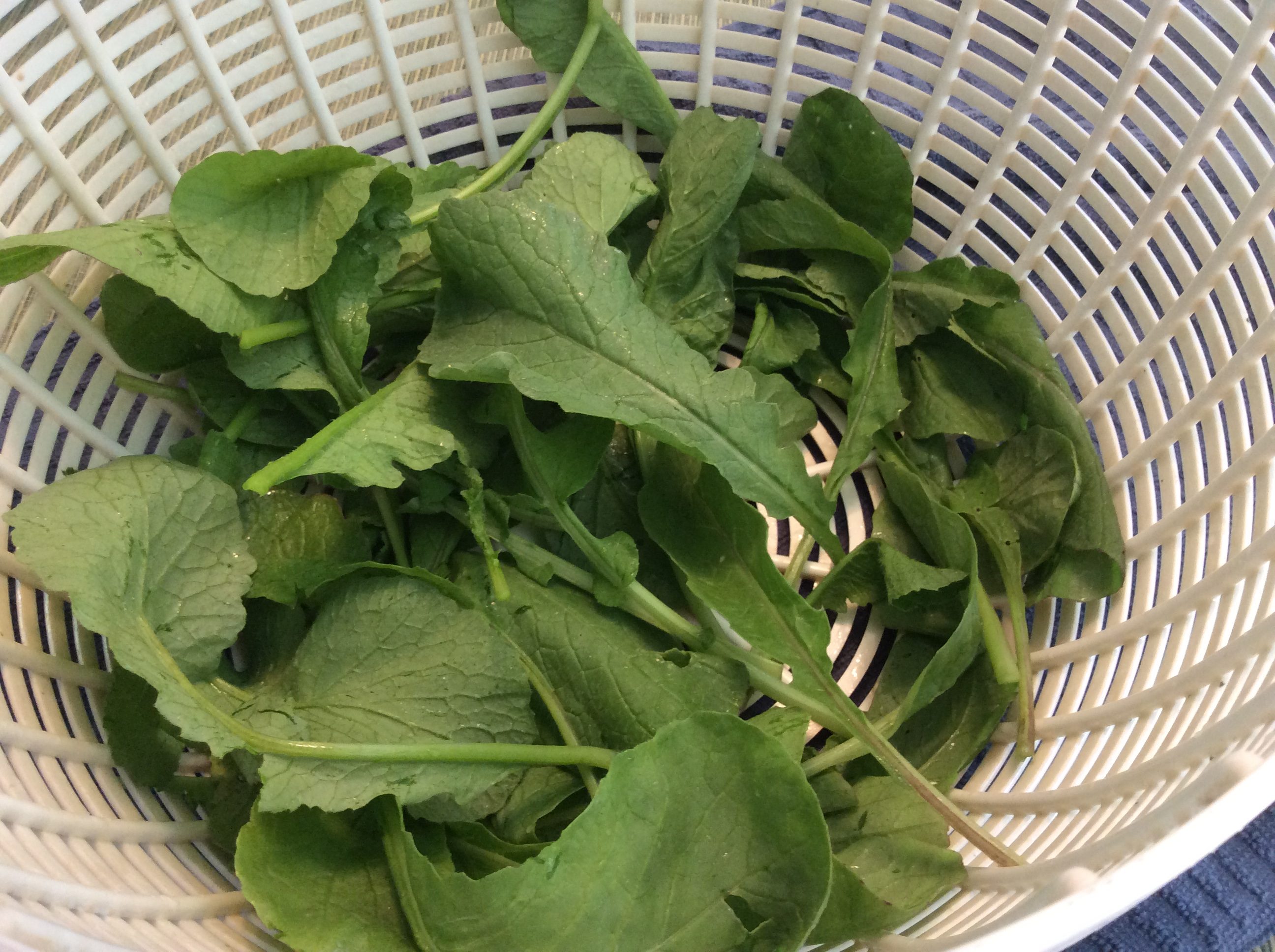 If you change the water regularly, they’ll keep for a while (these are from the 19th share box) and also lose some of that bite while still keeping their crisp. This makes them a great stand-in for the water chestnuts that you often find in a good spinach dip. Dice the whole radish, or chop up only the white centers if the pink color is off-putting to you in the dip