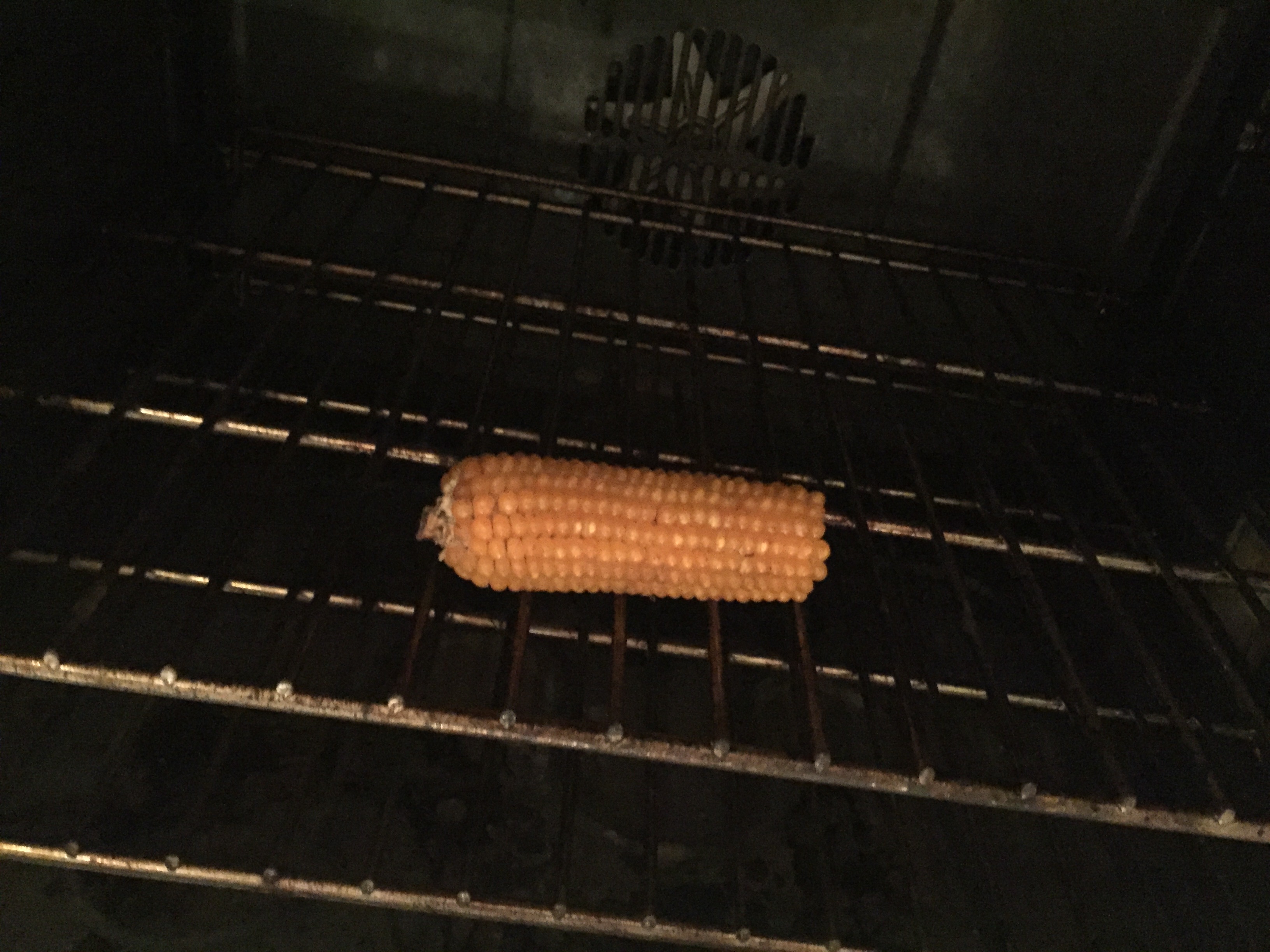 I had let this cob sit in the oven overnight with the door open. The oven was off but still hot from making dinner. I also added a second cob to the rack after taking this photo (and testing to find that the dried out kernels were in fact popping).
