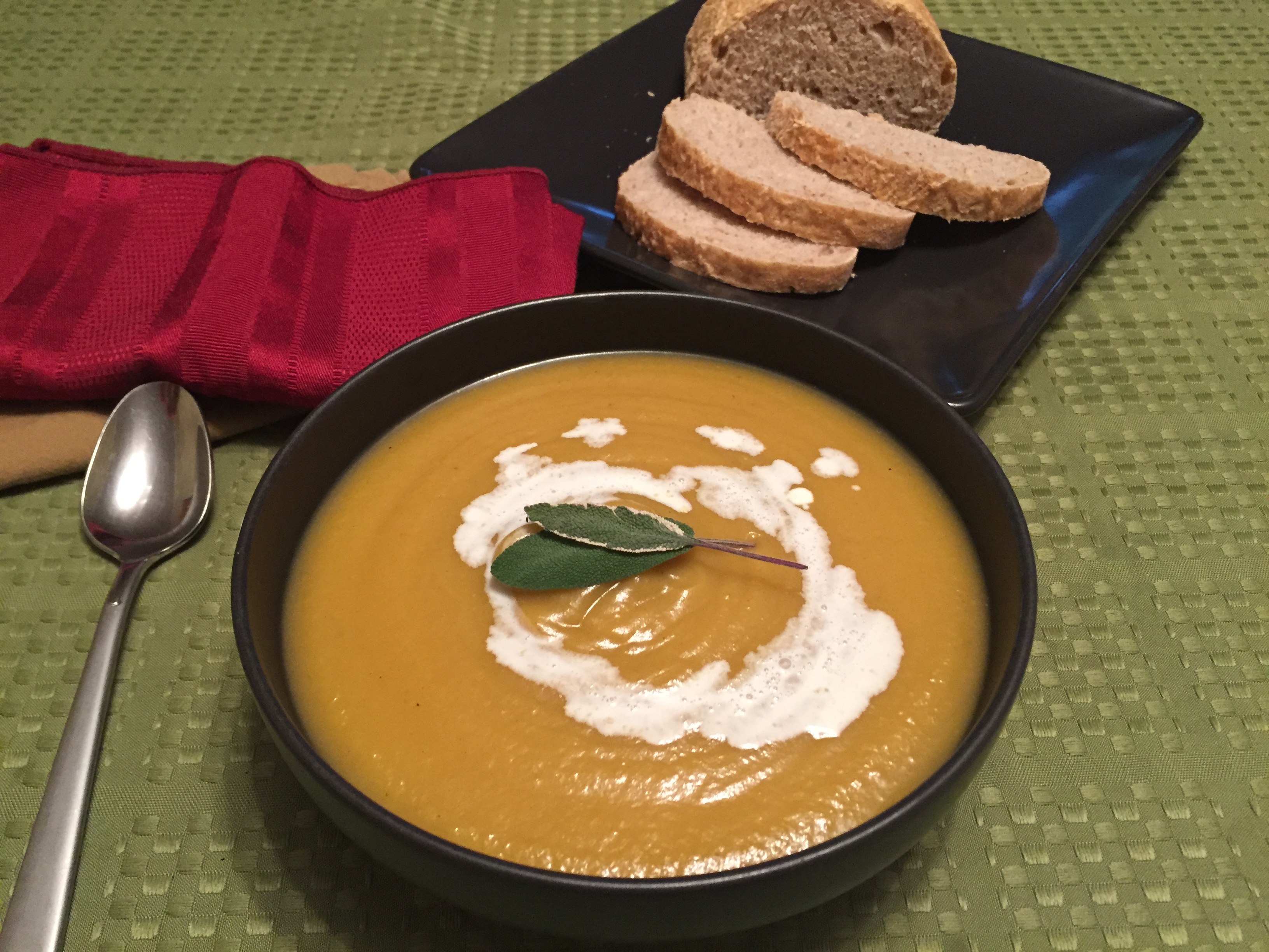 The herbs and spices I like to play with include sage, grated ginger, white pepper, brown sugar, cinnamon, nutmeg, maple syrup, salt, cayenne pepper or red curry paste. Used with care, these can compliment the soup in many different ways. Remember that adding a little at a time is the best way to go. Start with small amounts of the spices of your choice, give it a taste after cooking and blending, and if it still needs something, add it at the end. Tonight I wanted a bit more sweetness and added some homemade cinnamon applesauce to the puree.